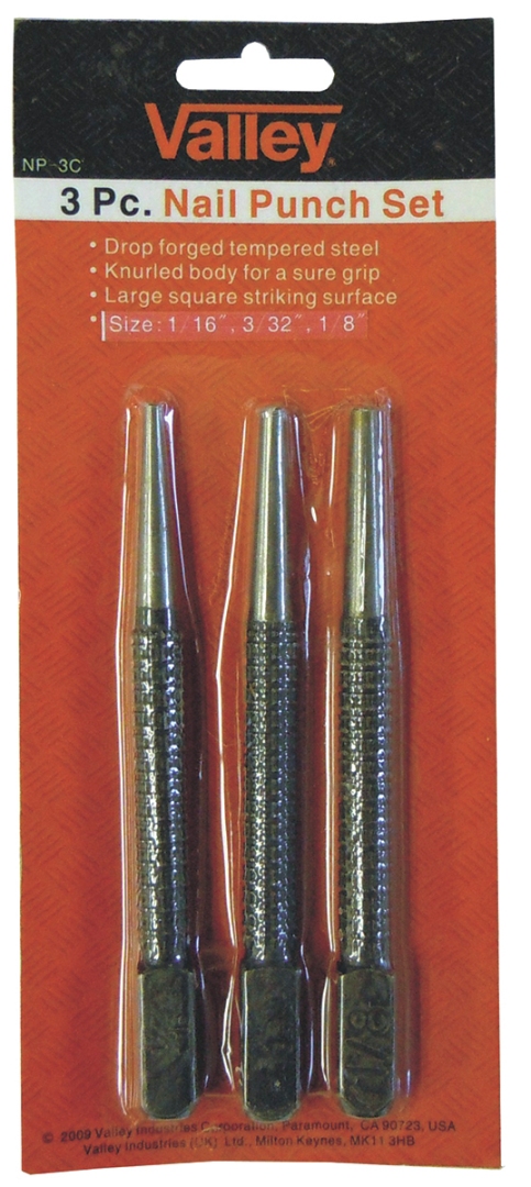 3 PC Nail Punch Set. Includes 1/16", 3/32" & 1/8" Punches