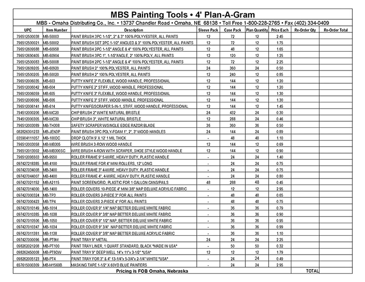 The perfect 4' plan-a-gram to start, stock, or supplement your paint department. Stocked with the basic everyday best selling painting tools. Total of 902 Pieces. $1,000.00 wholesale value at our regular price.